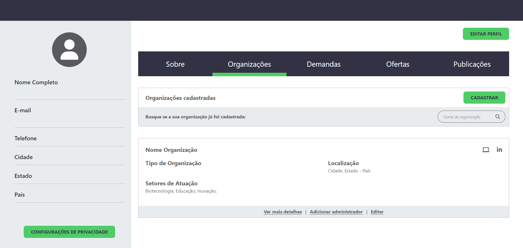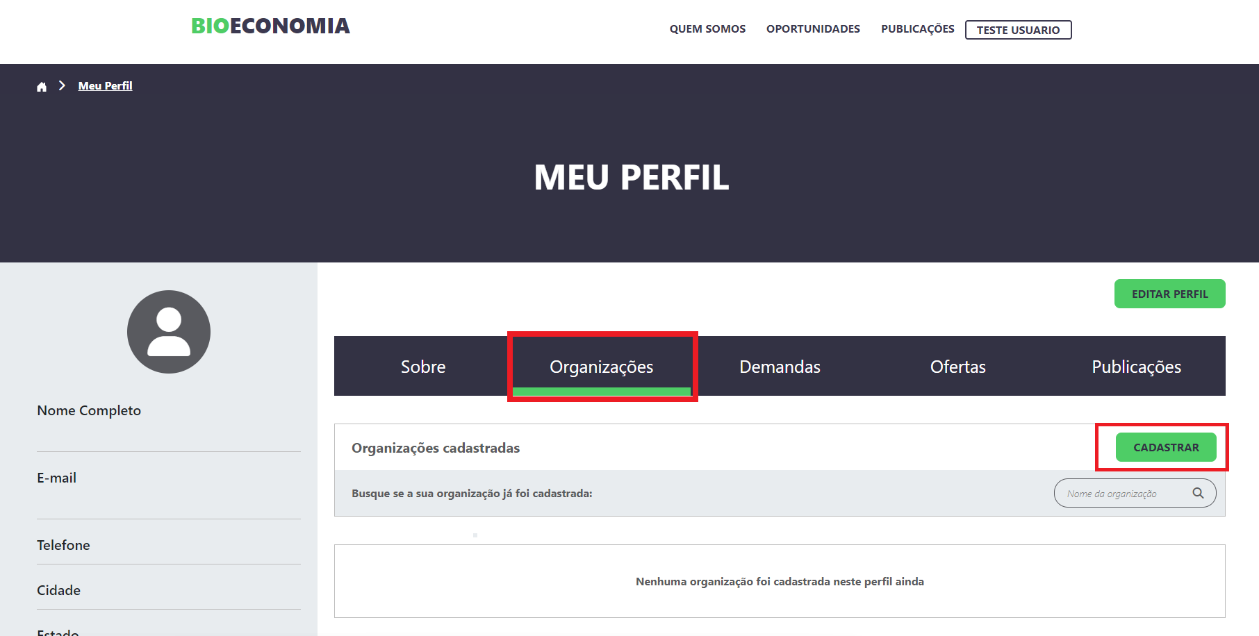 2. Nas abas logo abaixo do título ‘Meu Perfil’, clique em ‘Organização’ e depois no botão ‘Cadastrar’ para registrar sua organização.