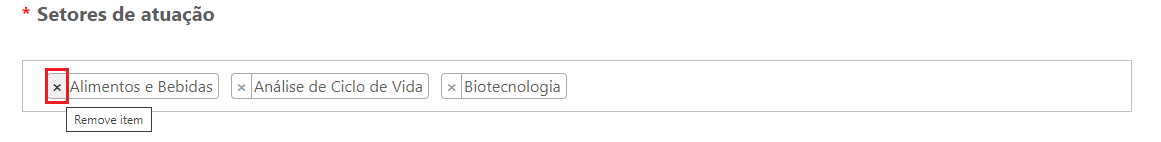 Você poderá inserir mais de um tópico no campo clicando novamente na barra e selecionando outro setor. Para excluir algum setor inserido no campo basta clicar no ‘x’ ao lado: