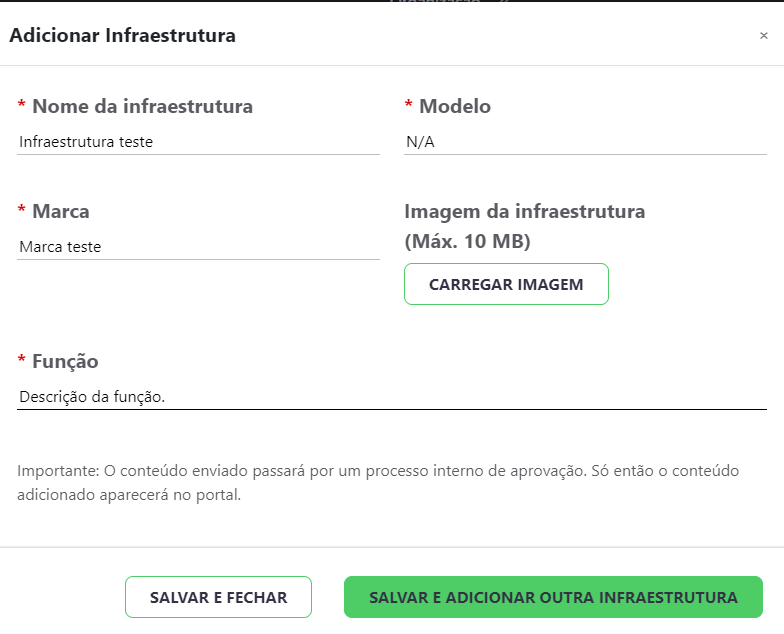 2.1 Para adicionar manualmente clique no botão ‘Adicionar infraestrutura manualmente’. Os itens com um asterisco (*) vermelho antes do título são itens obrigatórios, caso não haja a informação necessária para o cadastro, você pode inserir com ‘N/A’ ou um tracinho (-). Exemplo: