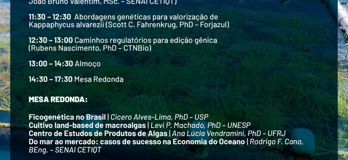 Dia 12 de abril às 10:30h, o SENAI CETIQT e parceiros irão realizar o encontro presencial "Valorização de Algas Marinhas com Biologia Sintética" na UFRJ - Universidade Federal do Rio de Janeiro. O objetivo do evento é discutir os aspectos científicos, tecnológicos e de inovação relacionado com as algas marinhas, envolvendo genética, cultivo, regulação, mercado, entre muitos outros tópicos relevantes. Local: Centro de Tecnologia da UFRJ, Cidade Universitária, Ilha do Fundão, Rio de Janeiro/RJ Interessados entrar em contato: comunicacao@cetiqt.senai.br